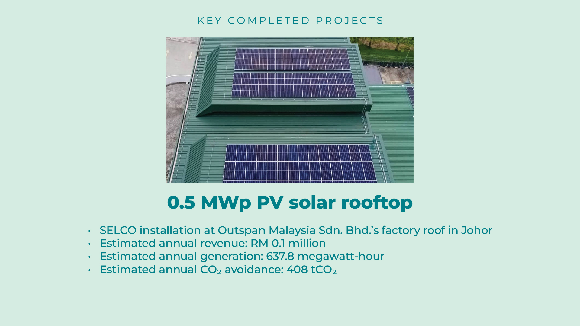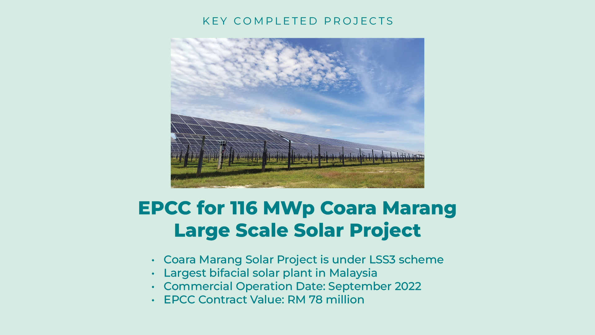 We also played the Engineering, Procurement, Construction & Commissioning (EPCC) role in the development of a 100 MW Solar Photovoltaic (PV) plant in Marang, Terengganu, and developed a 0.5 MW self-consumption (SELCO) solar power project for an industrial client.