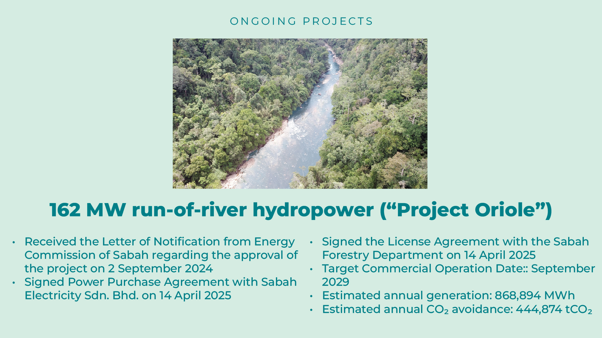 Our focus area is the development of the 162 MW Project Oriole hydropower project in Sipitang, Sabah, to be built using the same formula and approach as Telekosang Hydro. This project involves a development cost of RM 2.8 billion, and is slated to be completed by the end of 2028.